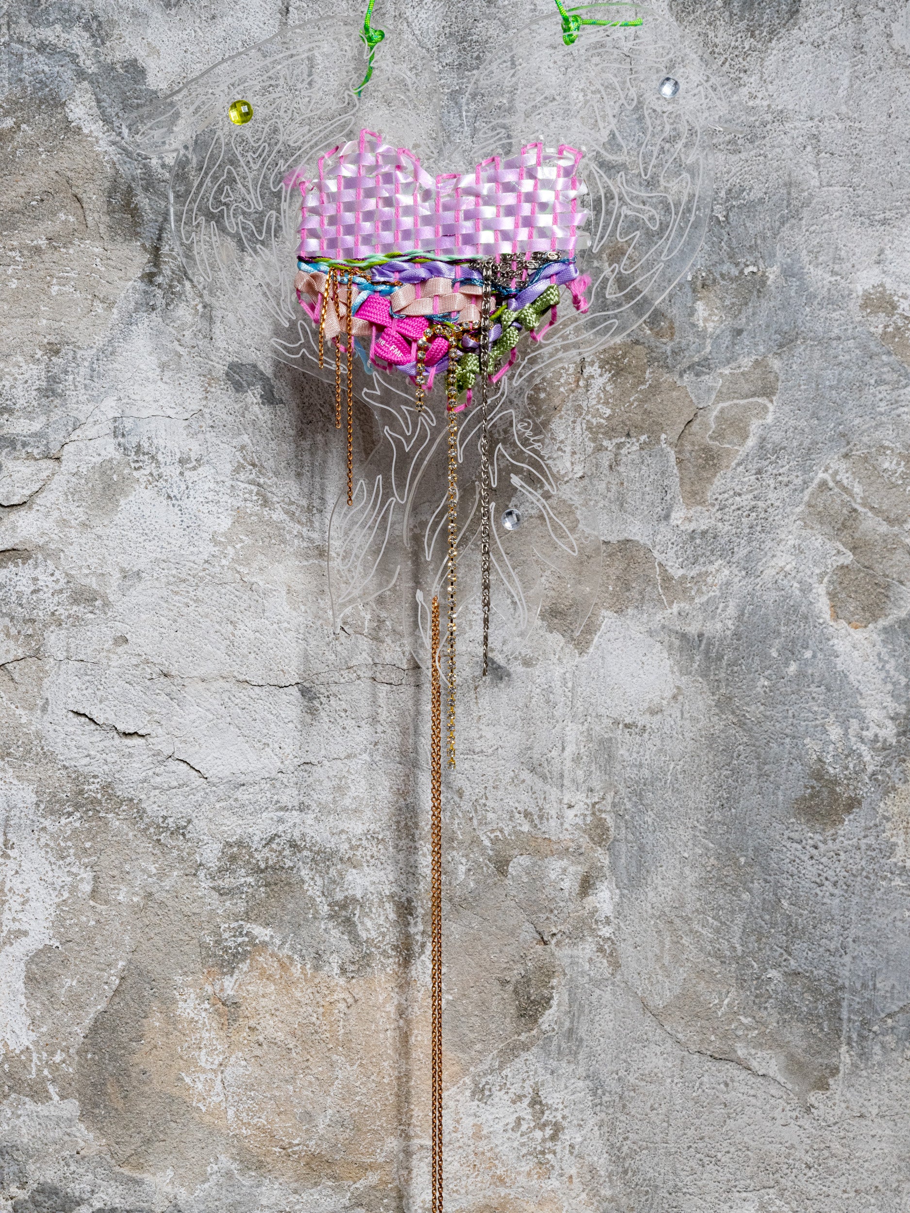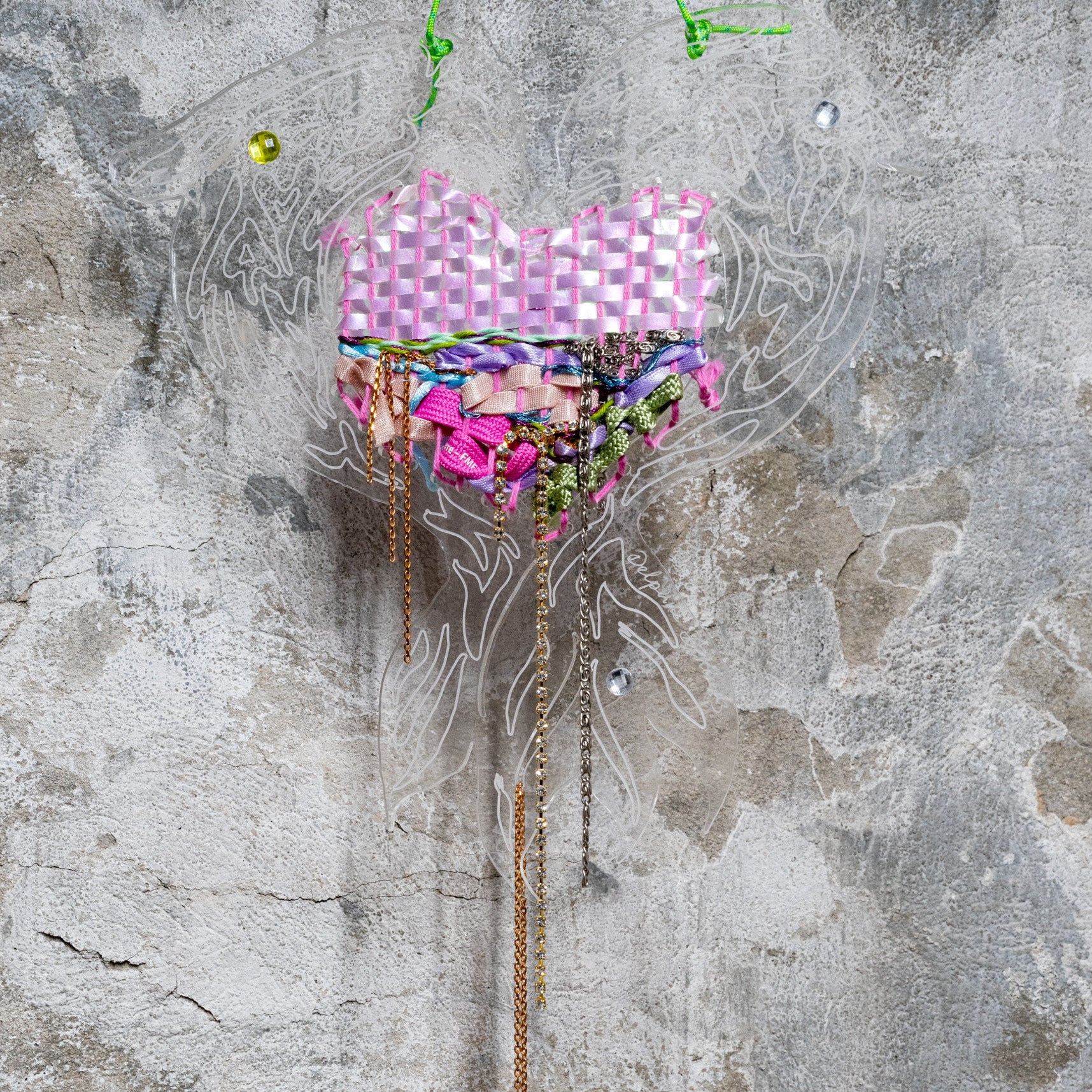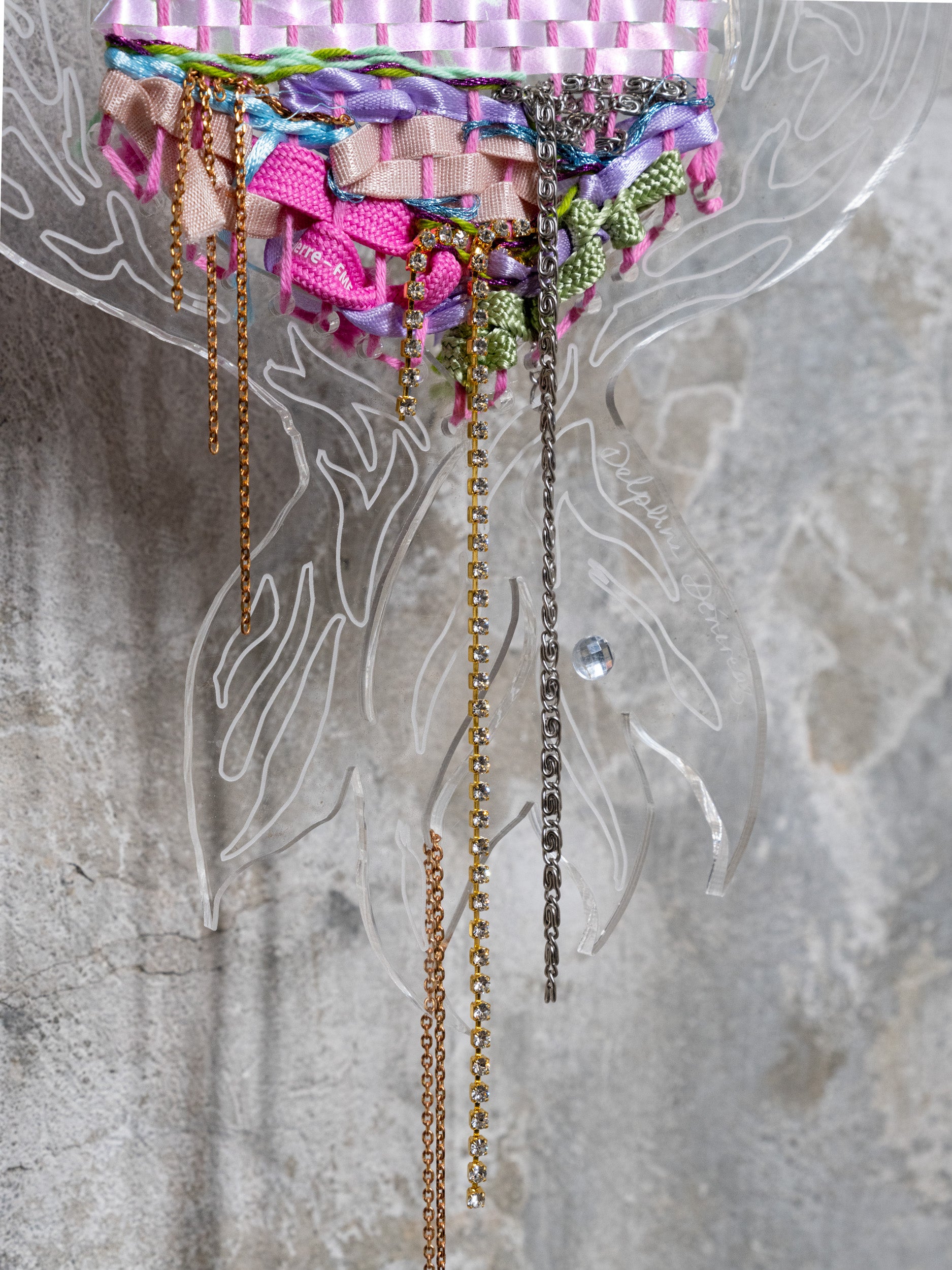 Lirette weaving, engraved/cut PMMA, recovered ribbons and chains