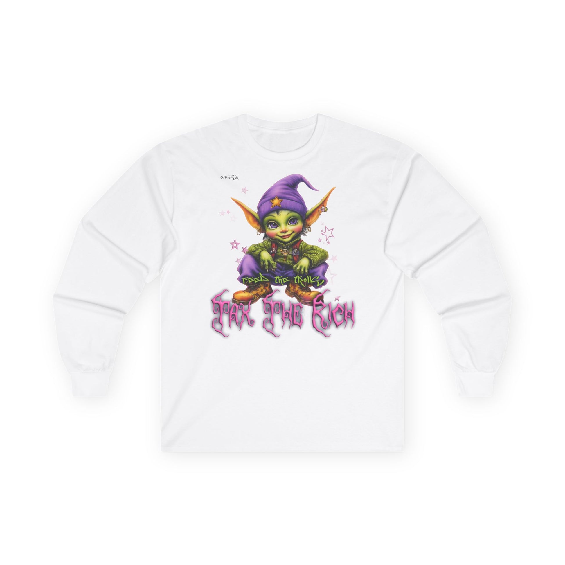 This long-sleeve tee pairs vintage-weight cotton with a playful, slightly mischievous design — a bright, elf-like character in purple and green clutching a stack of coins with graffiti-style lettering below. The thicker, tubular knit gives the shirt a structured, retro feel that holds printed art cleanly, while the ribbed collar and shoulder tape keep the silhouette tidy through wear. Wear it layered under a denim jacket for street-ready contrast, or alone to let the quirky artwork be the focus. It suits someone who collects bold, character-driven apparel and wants a comfortable, everyday top that still reads like a statement on market days, skate sessions, or late-night hangouts.