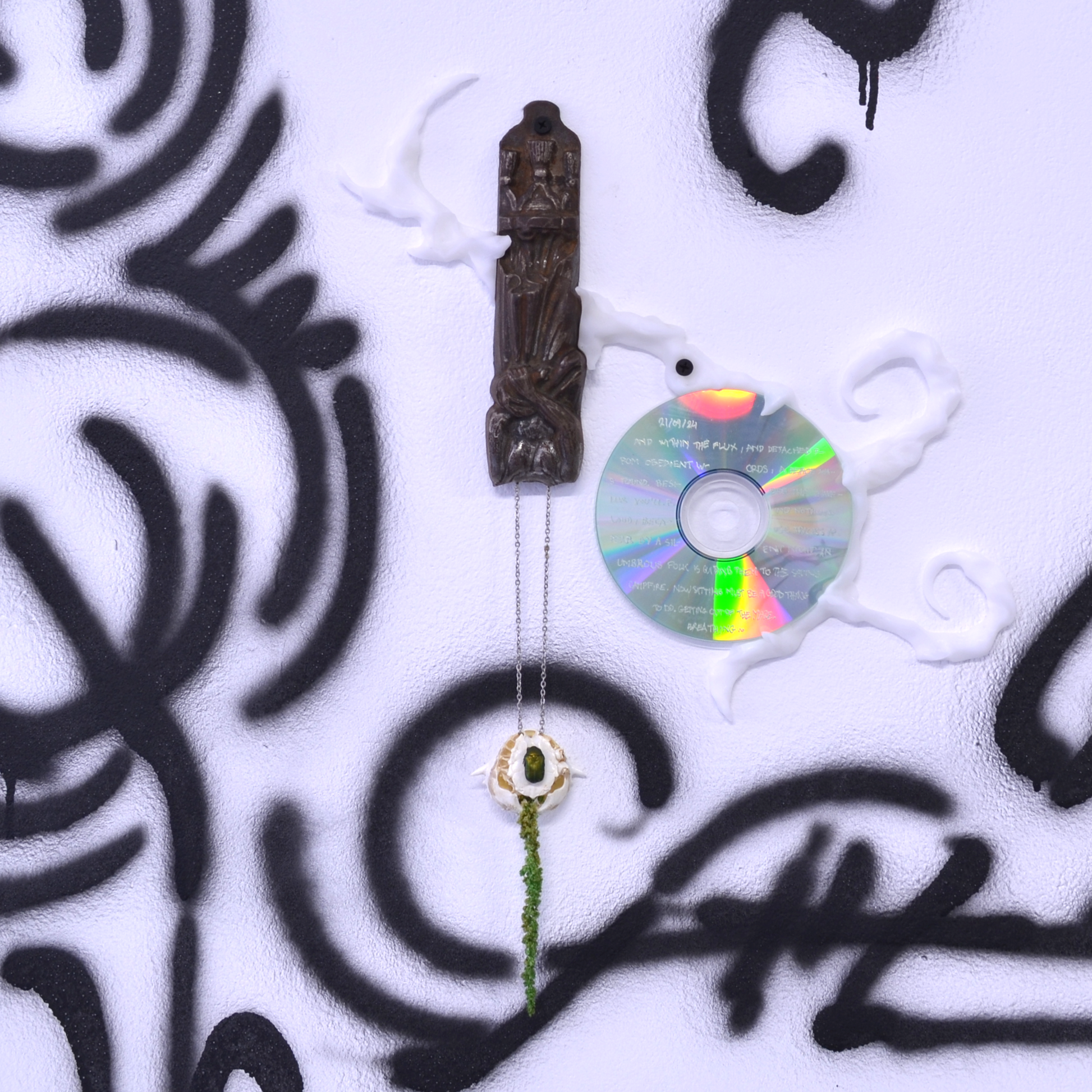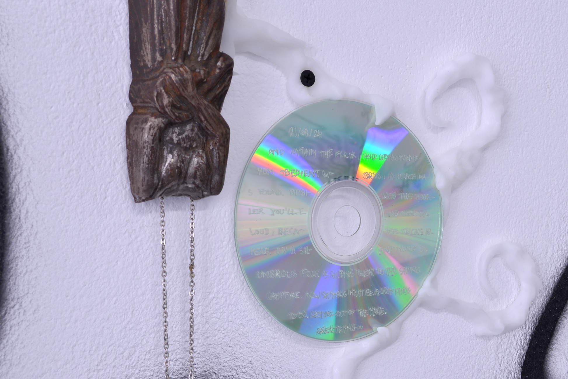 Assemblage sculptural, objets trouvés, CD gravés, plastique polymorphe