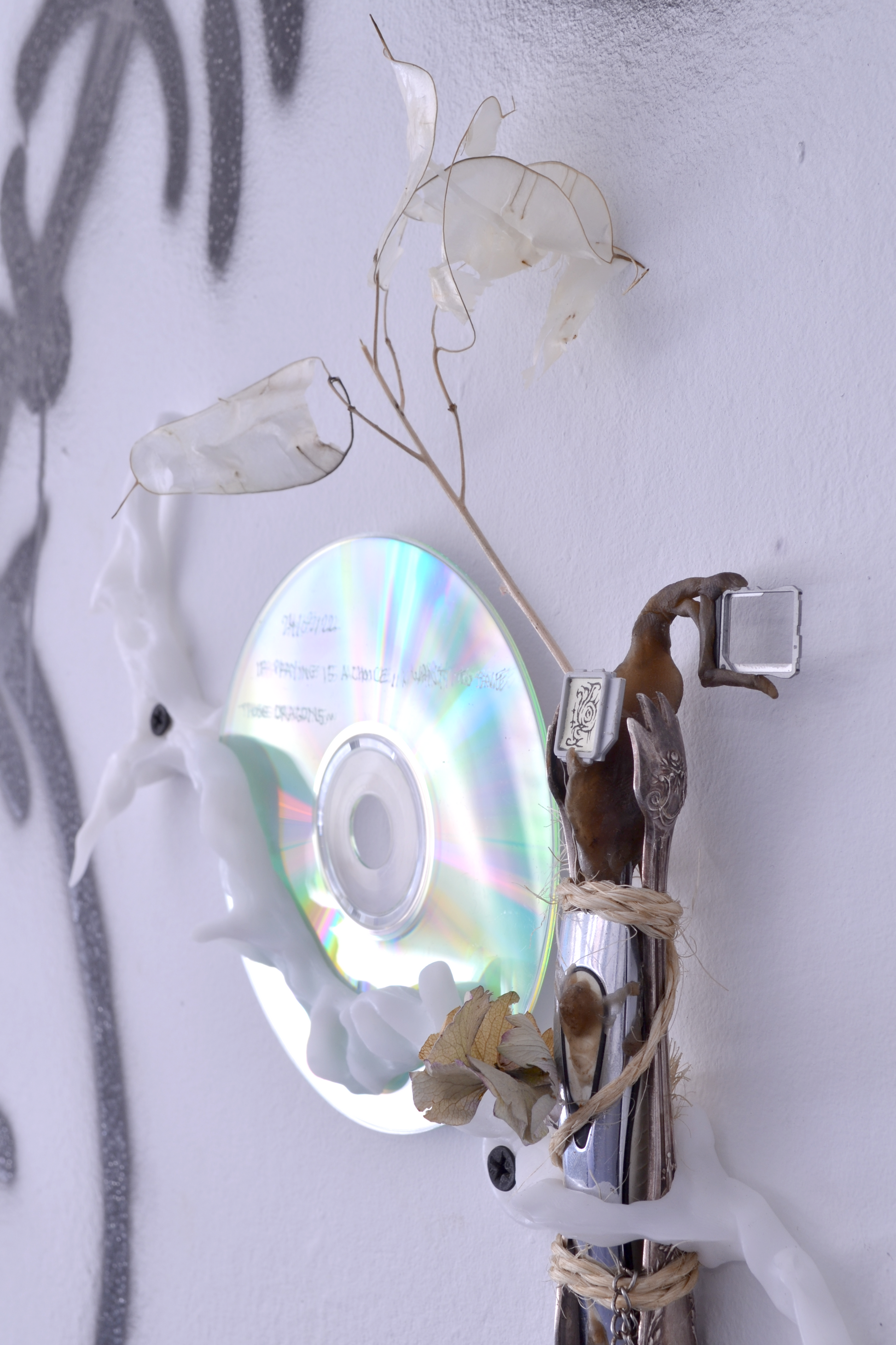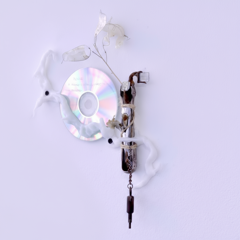 Assemblage sculptural, objets trouvés, CD gravés, plastique polymorphe