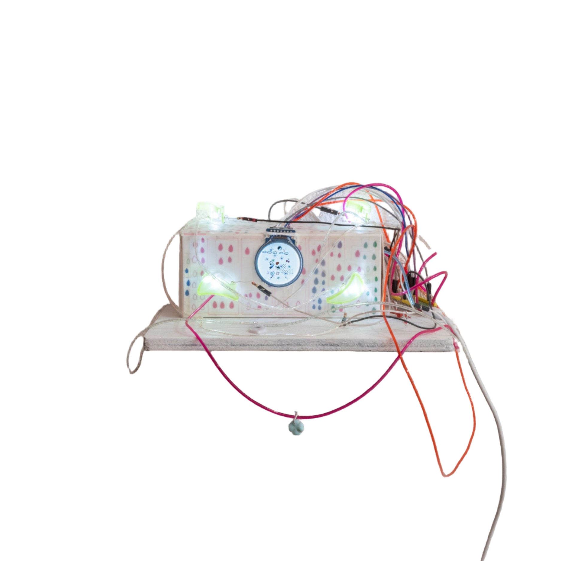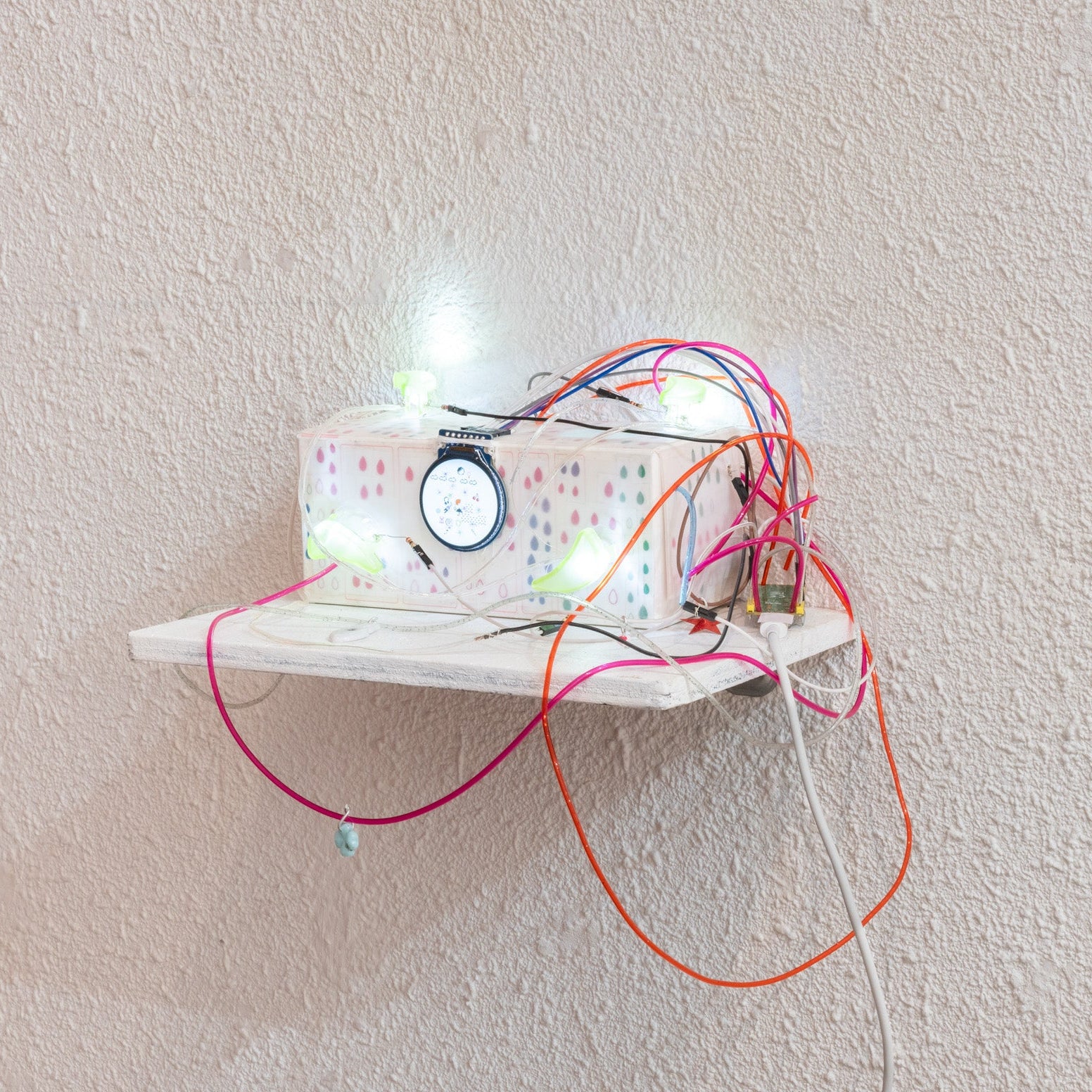 Cardboard, tracing paper, toy fragments, cables, scoubidou wires, conductive wires, sewing thread, LEDs, Raspberry Pico, TFT screen, mixed media
